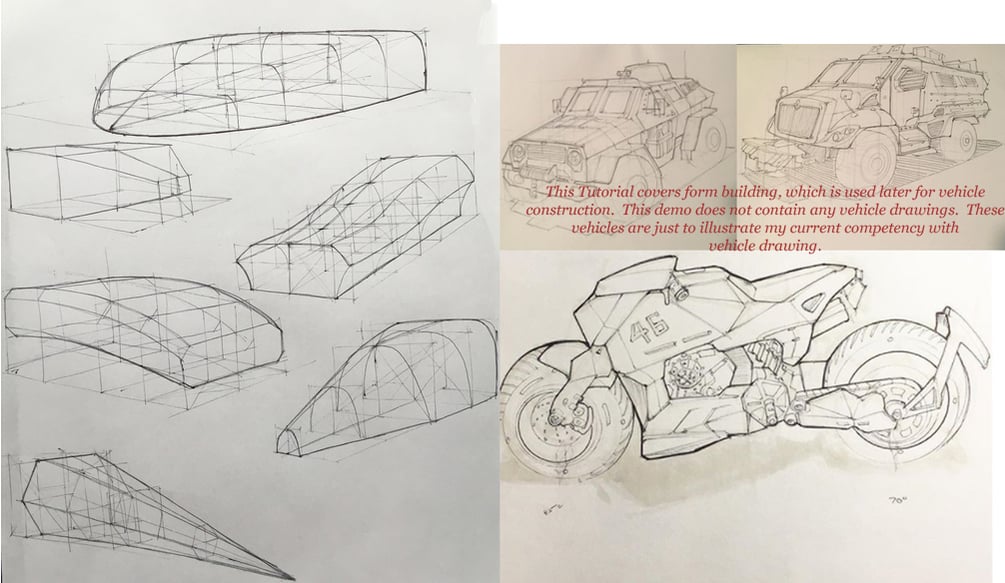 Note: This package covers form building, which you need to learn before you start drawing vehicles. Future packages will build on this material and will cover actual vehicle drawing both from reference, imagination, and life.